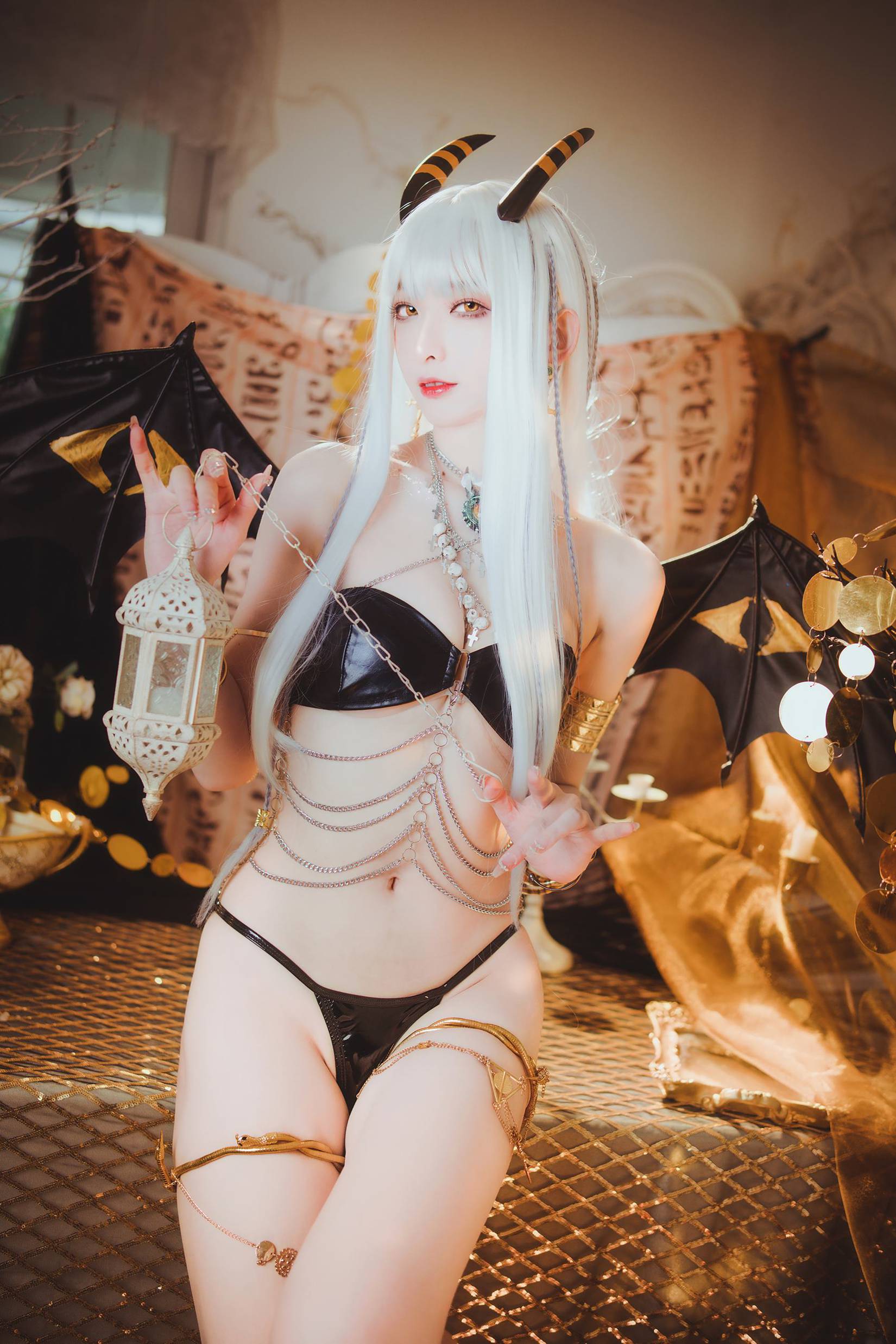 这组写真不仅注重细节还原,更在光影运用和场景构图上下足了功夫。摄影师巧妙地利用光线的明暗对比,营造出神秘而庄重的氛围。无论是室内还是外景拍摄,每一帧都像是精心设计的画面,充满了艺术张力。