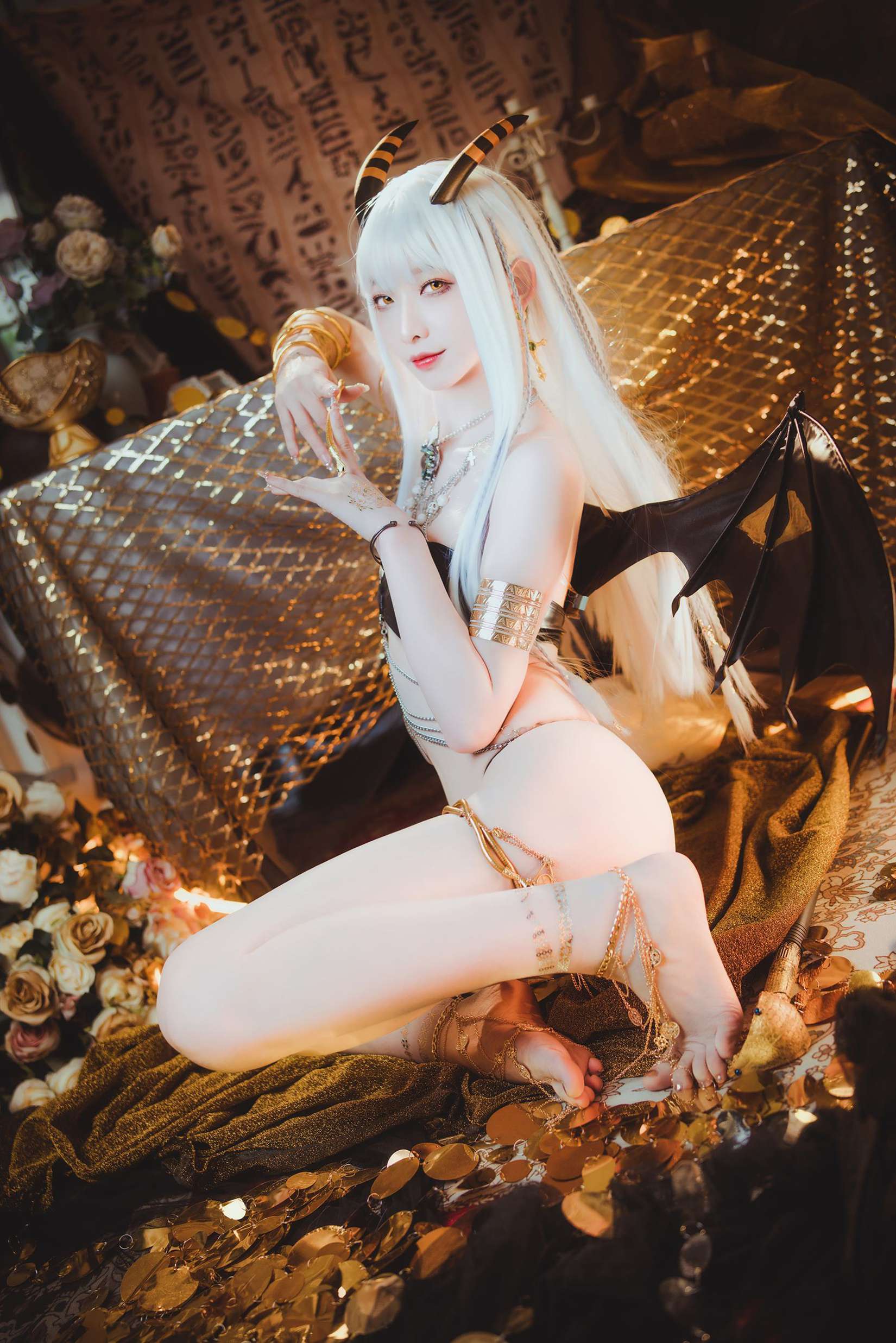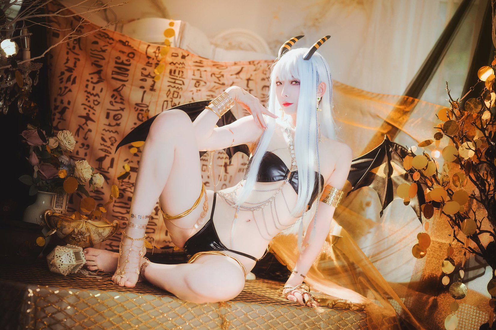 特别值得一提的是,这组写真中的场景布置极为考究。从金字塔般的背景到沙漠中的帐篷,每一个场景都经过精心搭建,为角色塑造提供了完美的视觉支撑。这些细节不仅提升了作品的专业度,也让整组写真更具观赏性。