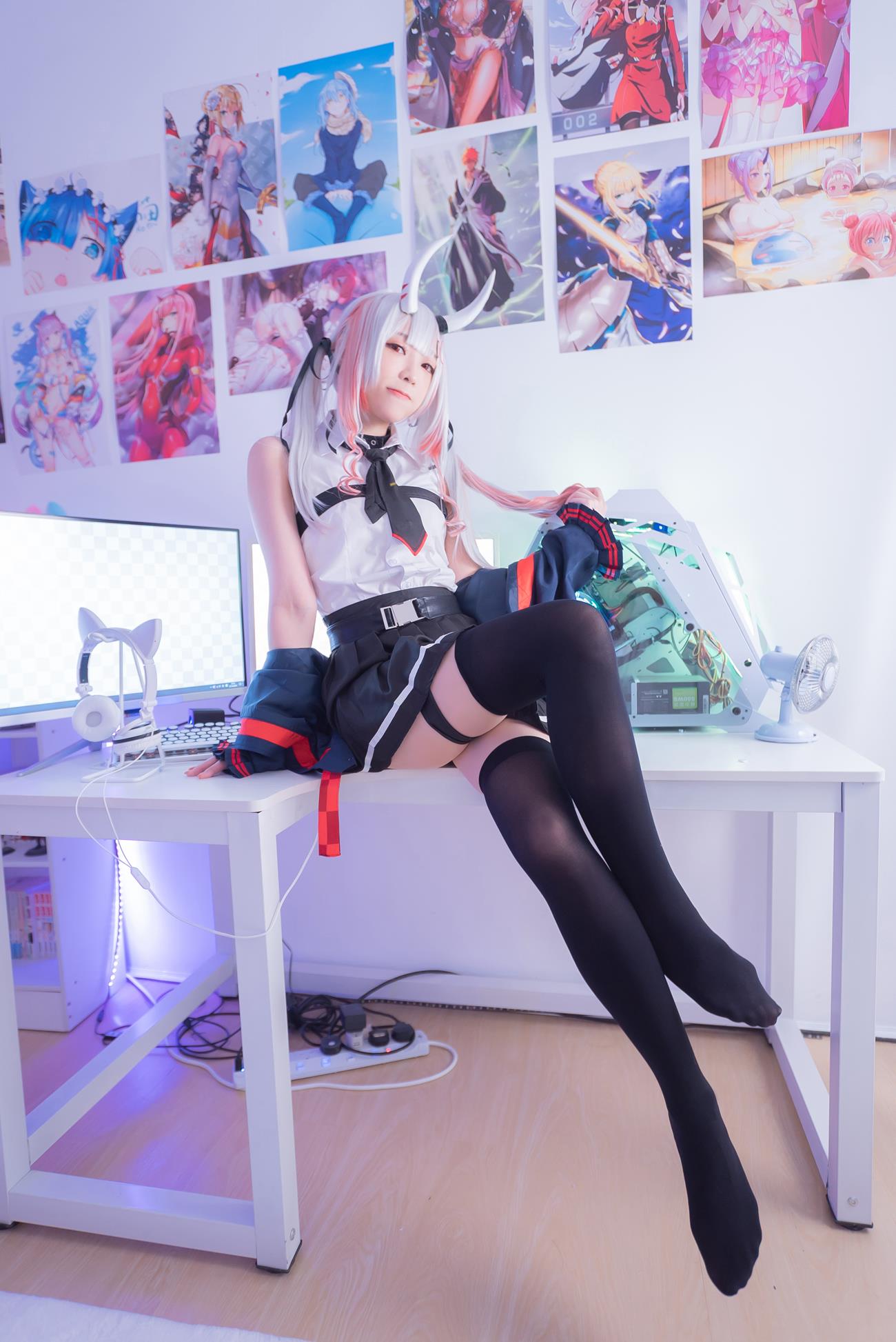 在角色还原方面,YuDan对服装、妆容及配饰的考究令人惊叹。从服装的每一个褶皱到饰品的光泽,再到场景中的每一个微小细节,都体现了制作团队的用心。Nakiri Ayame的坚毅眼神和自信的姿态,在摄影师的镜头下显得格外动人。
