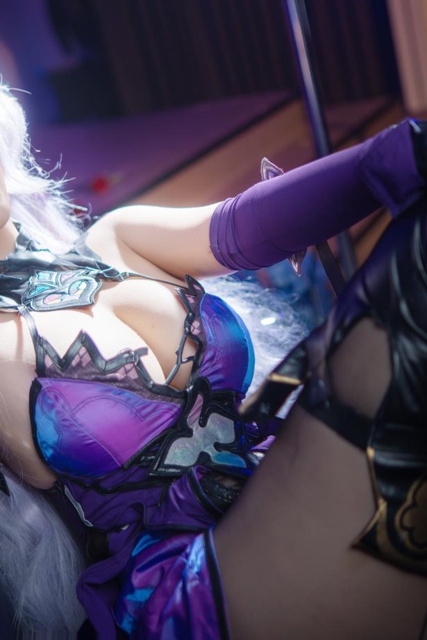 此外,这组写真在光影运用和场景设计上也下了很大功夫。柔和的光线与深邃的背景相得益彰,不仅突出了角色的优雅气质,还营造出一种神秘而高贵的氛围。可以说,这不仅仅是一组cos作品,更是一件值得细细品味的艺术品。