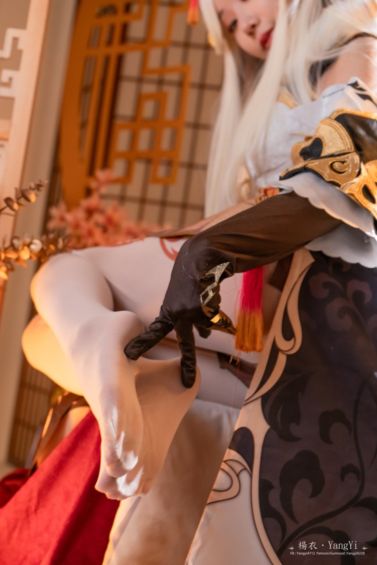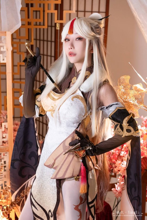 图集中,凝光标志性的白色长袍和金色装饰在楊衣身上栩栩如生。复杂的褶皱和刺绣细节被摄影师精准捕捉,展现了高超的服饰还原技术。